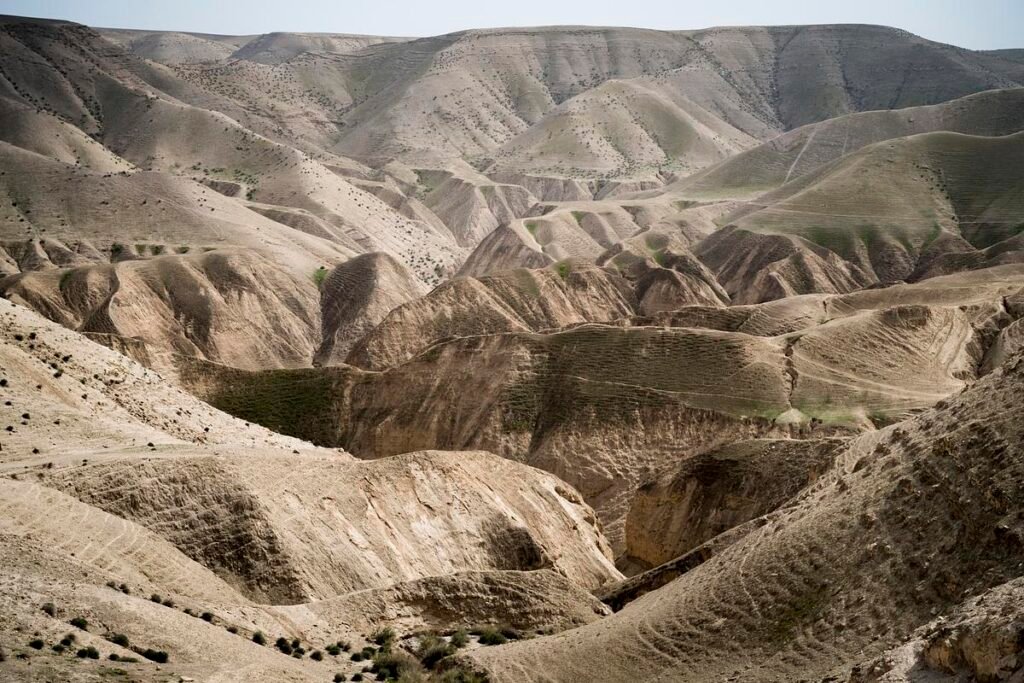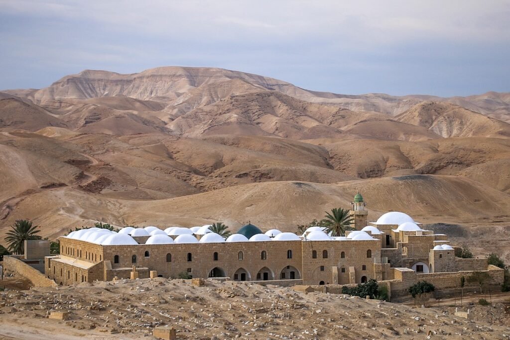 Stretching west and south of Jericho, the Judean Desert is a stark yet breathtaking landscape of rolling hills, dry riverbeds, and dramatic cliffs. Its silence and vast horizons have drawn prophets, hermits, and pilgrims for centuries. This is the wilderness where Jesus is believed to have fasted for 40 days, and where countless monasteries and hermit caves still cling to the rocky slopes.