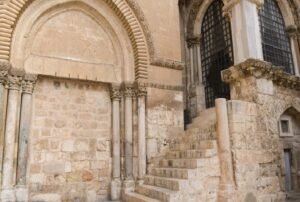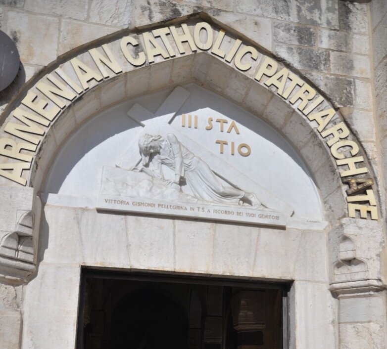 Located at the entrance to the Church of the Holy Sepulchre, symbolizing His final fall.